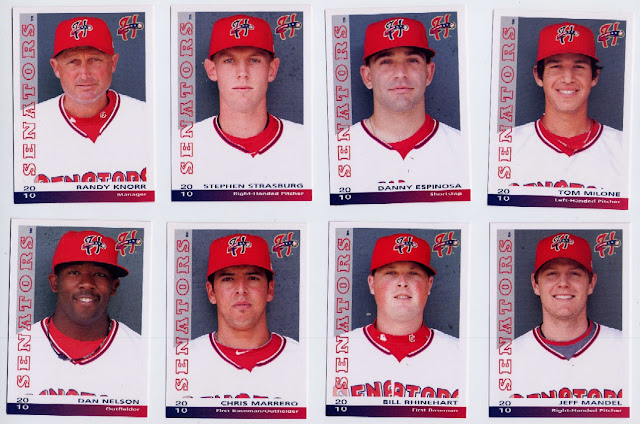 Here is a team set I acquired from Ebay (about 2 weeks ago) for 14 bucks plus 4 shipping brand new still sealed in the original clear cello-plastic wrapper. In past years I might have tried to find 2 sets, one to keep sealed and one to open up and "show off". Note due to many reasons I don't "show off" my collection or display it, I just basically "store" my collection. Now days I don't bother with the 1 to keep sealed and 1 for the "collection" although I did that years ago with the 2005 Topps Washington Nationals Commemorative Box Set. Any way the set is the Minor League farm Team Set of the 2010 Harrisburg Senators by Grandstand. It is a 28 card set. It includes the Manager (Randy Knorr (Front Card)), Both the Hitting and Pitching coaches (Troy Gingrich, Randy Tomlin) and the Trainer (Alsushi Toriida (Back Card)). Key player cards and Notable Nats are: Stephen Strasburg, Drew Storen, Matt Chico, Danny Espinosa Jhonatan Solano, and Chris Marrero.